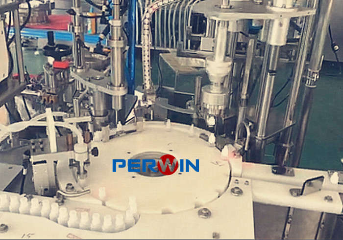 • びんがスター ホイールに来る場合、機械は差し込むことおよびおおうプロセスを満たし始める。上昇および落下満ちるシステムは2つの線形蠕動性ポンプによって泡立ち、1つのおおう頭部によっておおう1つの差し込む頭部によって差し込むことを保障しない。